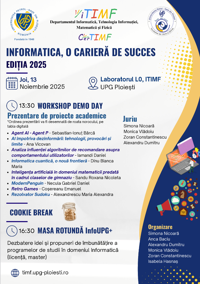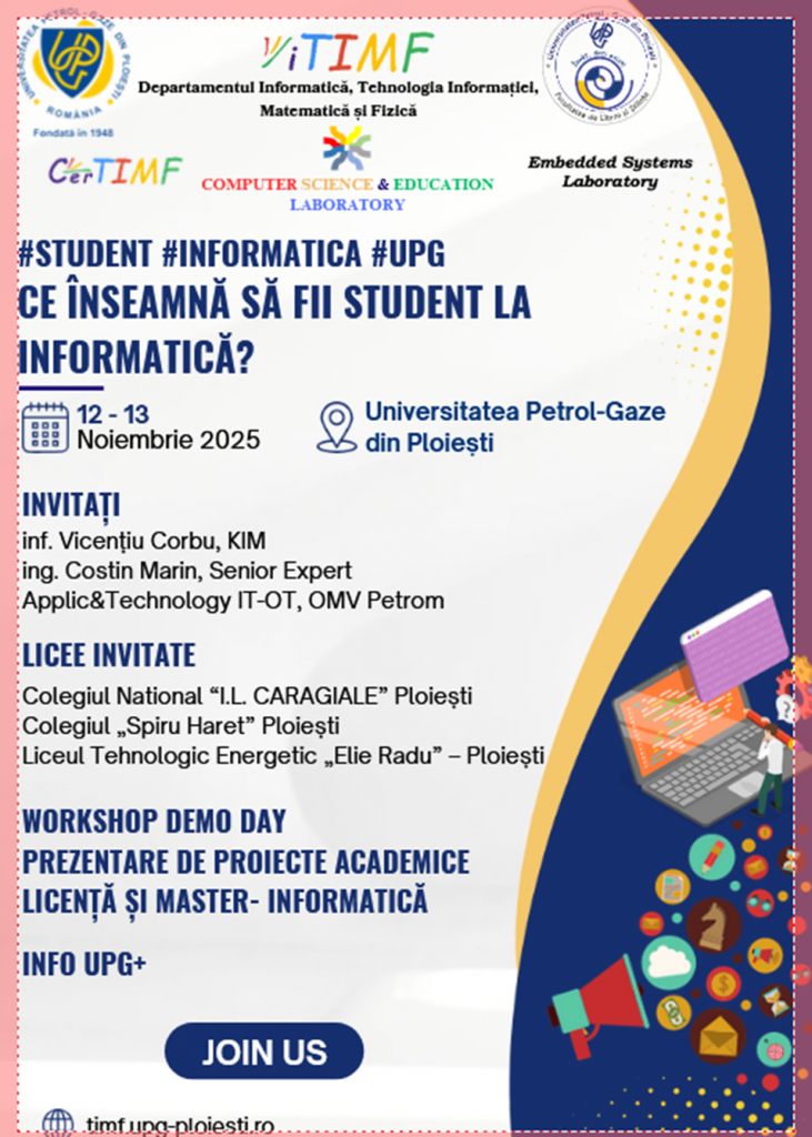 Departamentul Informatică, Tehnologia Informației, Matematică și Fizică organizează în perioada 12 – 13 noiembrie 2025 evenimentul #Student #Informatica #UPG – Ce înseamnă să fii student la Informatică?, ediția 2025.